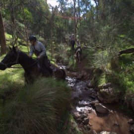 This ride with Watson’s Mountain Country Trail Rides departs from the family farm and rides up to spectacular views in the morning. Then ride down to the ‘Dungeon Hut’ for lunch by the camp fire. In the afternoon groups traverse creek beds and bridle trails through to the next valley Howqua where the ride finishes…